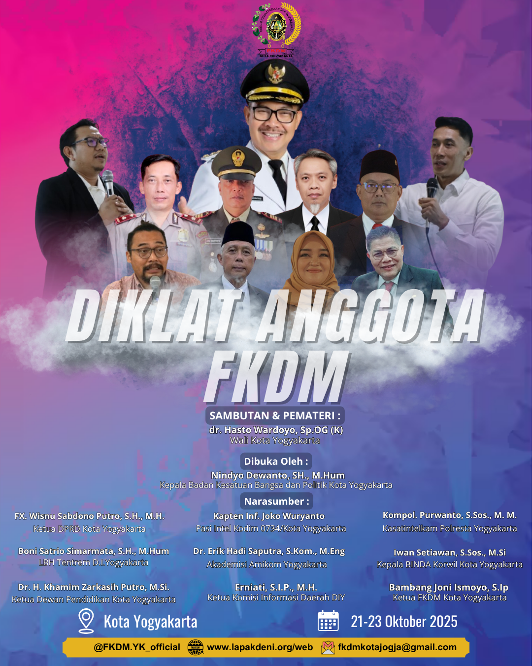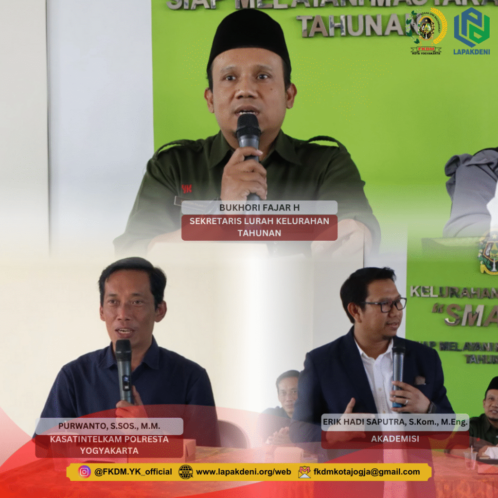 Kegiatan ini dibuka oleh Ketua FKDM Kota Yogyakarta, Bapak Bambang Joni Ismoyo, dan menghadirkan narasumber dari BINDA DIY, Polres Kota Yogyakarta, serta ahli website dan aplikasi LAPAKDENI.